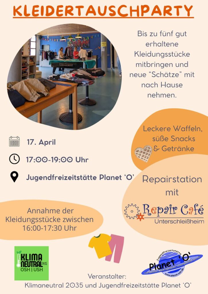 Im Rahmen der 4. Kleidertausch der AG „Müllvermeidung“ der Initiative „Klimaneutral 2035“ findet in den Räumen der Jugendfreizeitstätte Planet „O“ in Oberschleißheim diesmal auch ein Repair Café statt.